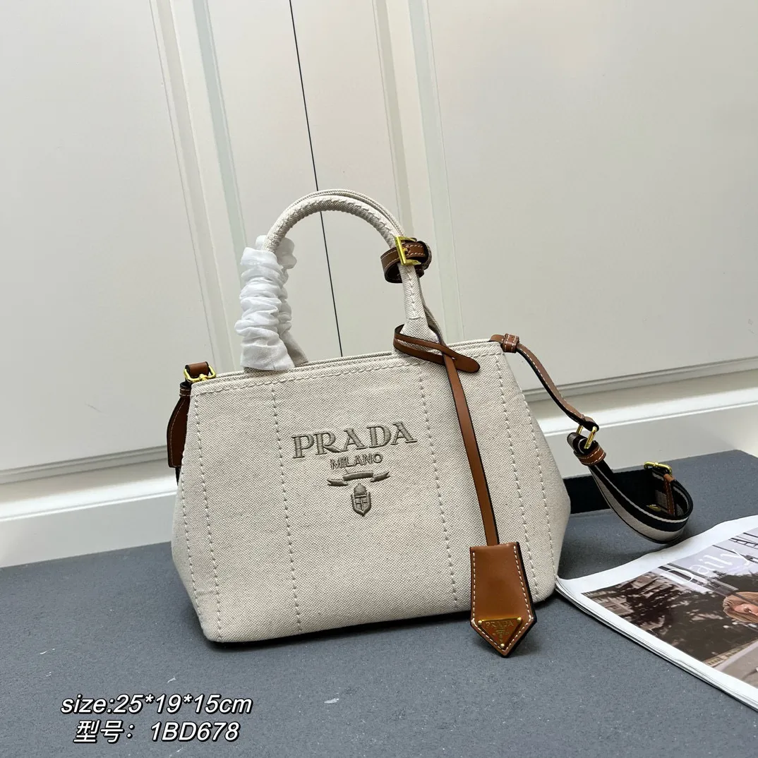 PRADA linen blend and leather tote bag, size: 25*19*15cm